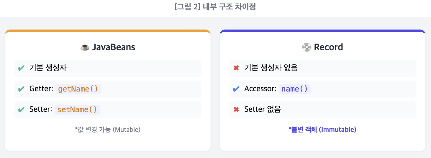 Record를 사용할 때 가장 많이 헷갈리는 부분이 바로 "기존 라이브러리와의 호환성"이다. 이는 Record가 자바빈즈 규약을 따르지 않기 때문이다.