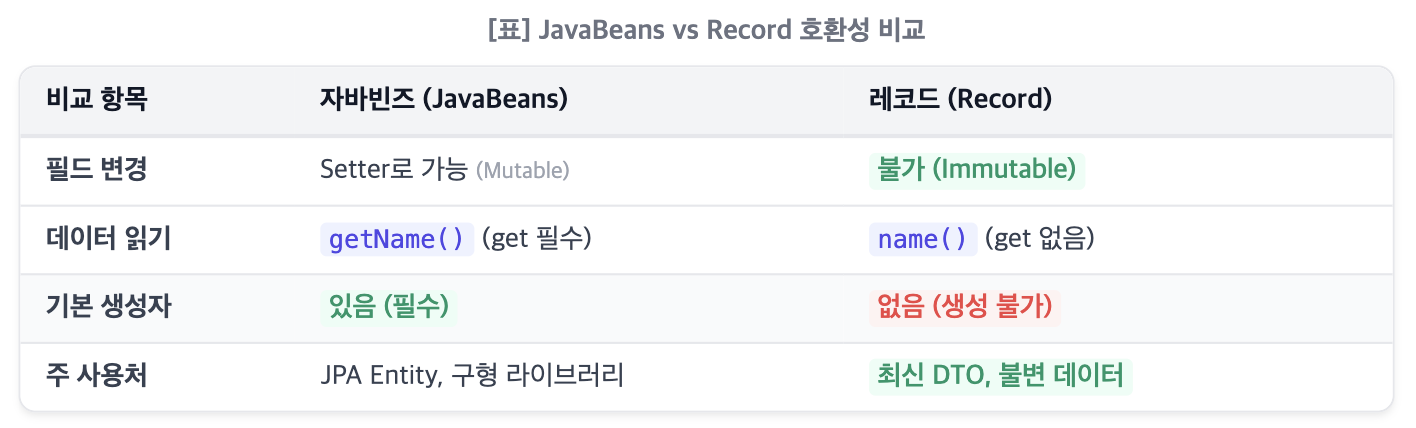과거의 프레임워크나 라이브러리(구형 Jackson, Hibernate 등)는 "Getter 이름 규칙(get...)"과 "기본 생성자"에 의존하여 동작했다. 그래서 record를 사용하면 필드를 인식하지 못하거나 객체를 생성하지 못하는 에러가 발생하곤 했다. "Record는 잘 안 쓴다"는 오해는 여기서 비롯되었다.